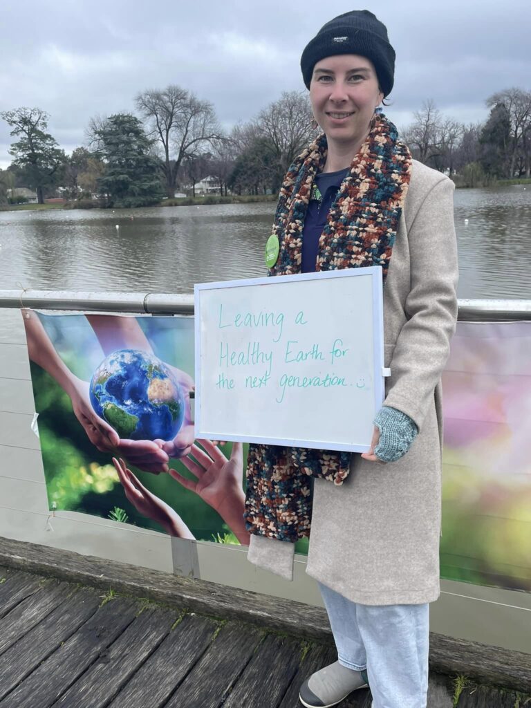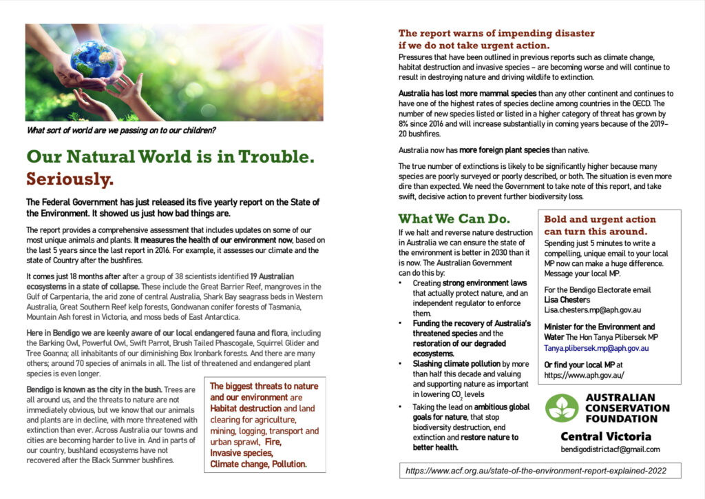 The Central Victoria ACF group held a pop up stall in August 2022 at Lake Weeroona in Bendigo. With members of the group, I assisted with putting together a banner which featured a pair of adult hands passing on planet Earth to a younger set of hands.
